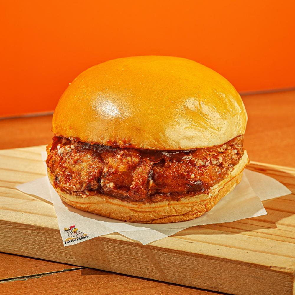 Filé de peito 100 g, barbecue, queijo tipo cheddar e molho da casa.