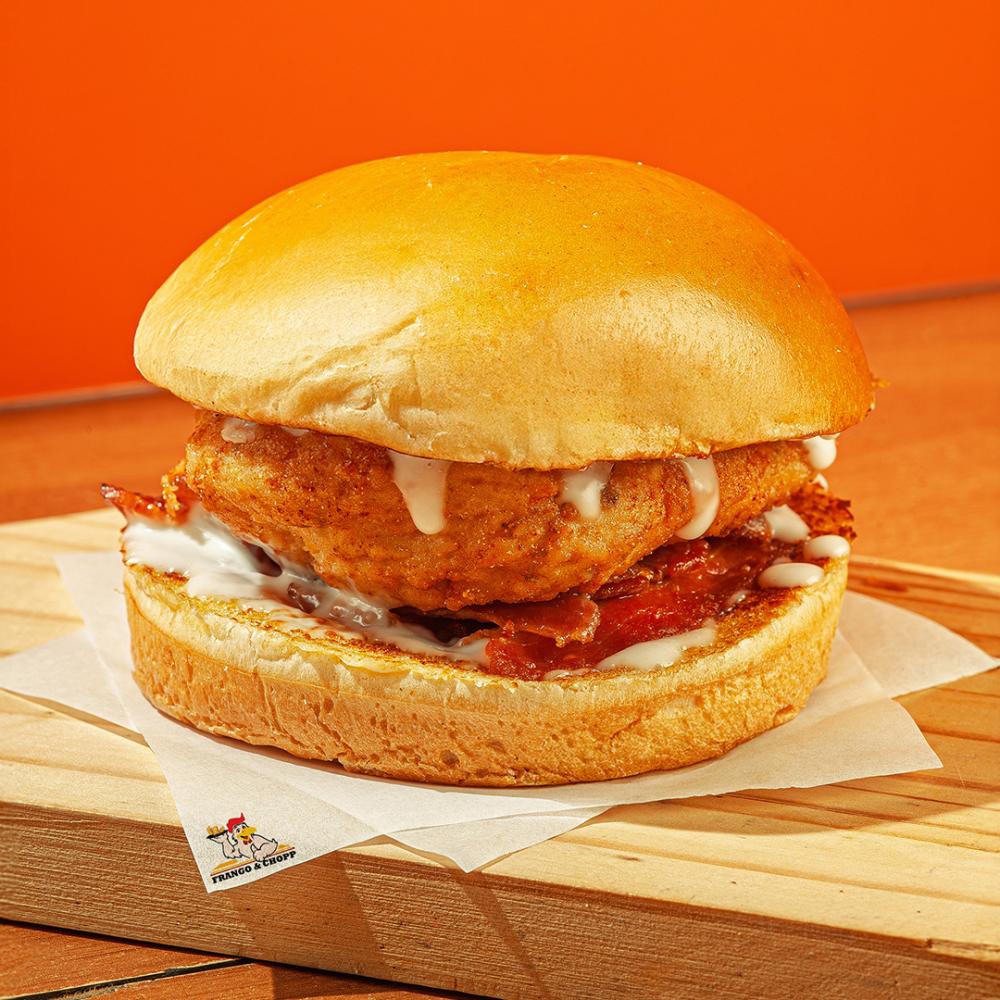 Sanduíche com filé de peito 120 g, fatia de bacon, queijo tipo cheddar fatiado, molho especial da chef no pão.
