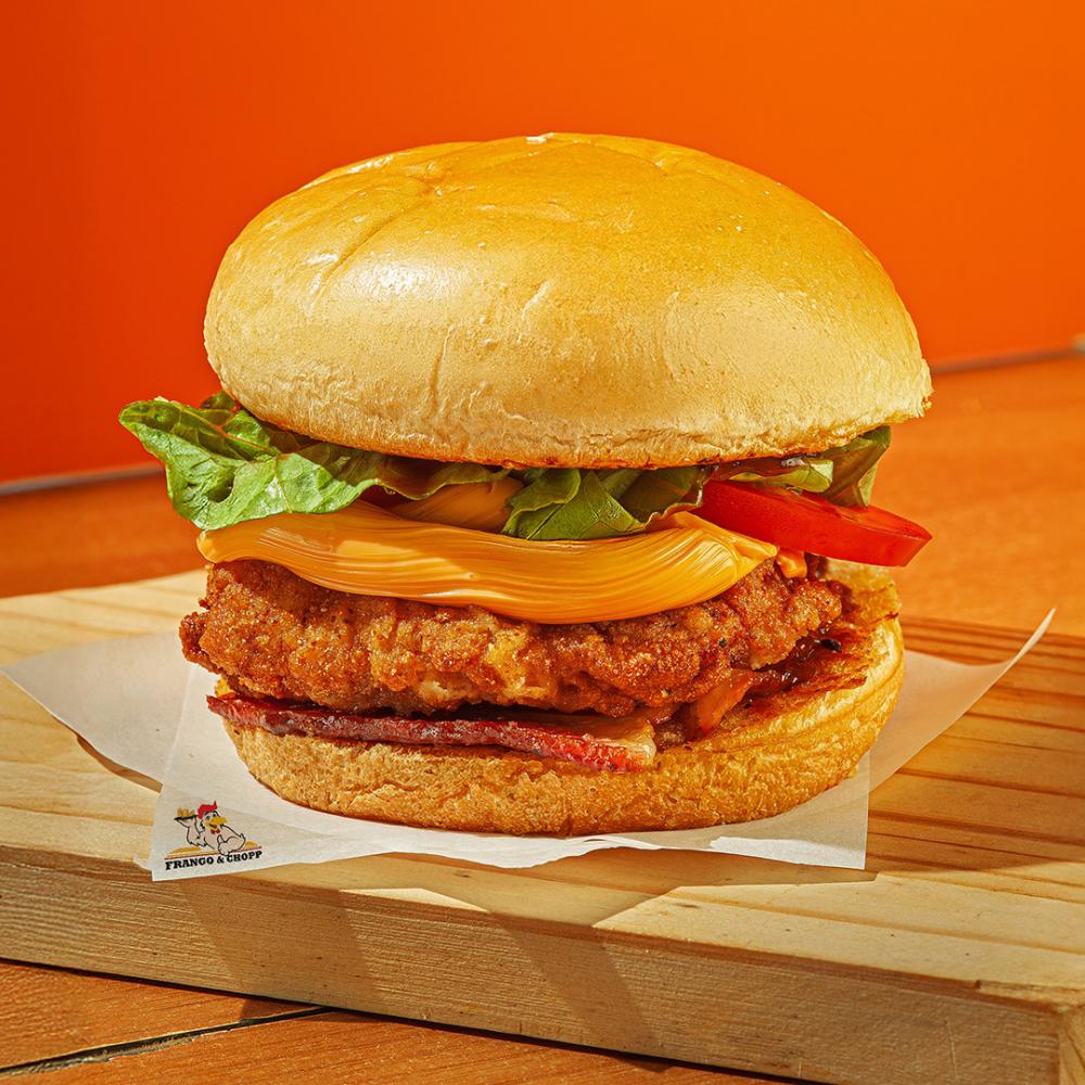 Sanduiche com filé de peito empanado 100g, Cheddar cremoso, barbecue, bacon, tomate e alface.
