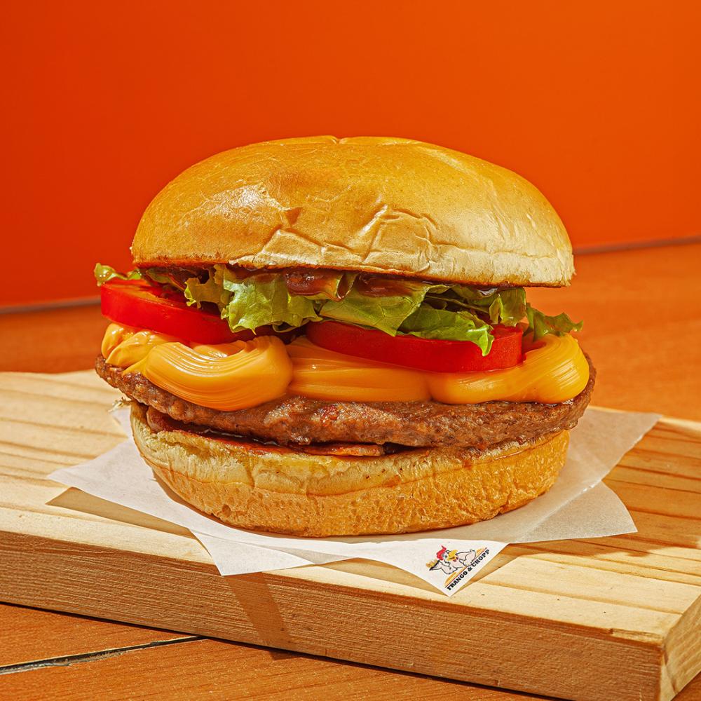 Pão, bife de hambúrguer 90g, cheddar cremoso, bacon, barbecue, tomate e alface.
